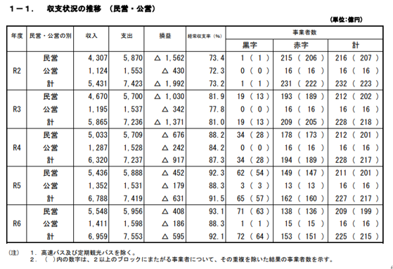 令和6(2024)年度までの乗合バス事業(保有車両30両以上の事業者を対象)の収支状況の推移をみたものが表-1です.