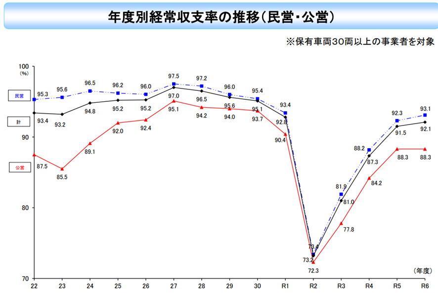 そして,公営だけでなく,民営バスもこのグラフのスタートにあたる2010(平成22)年度から1度も収支率が100%=収支均衡ができていないということがわかります.乗合バスを黒字化するべきだ,という意見も少なくありませんが,この状況をみると,なかなか厳しいことがわかります.