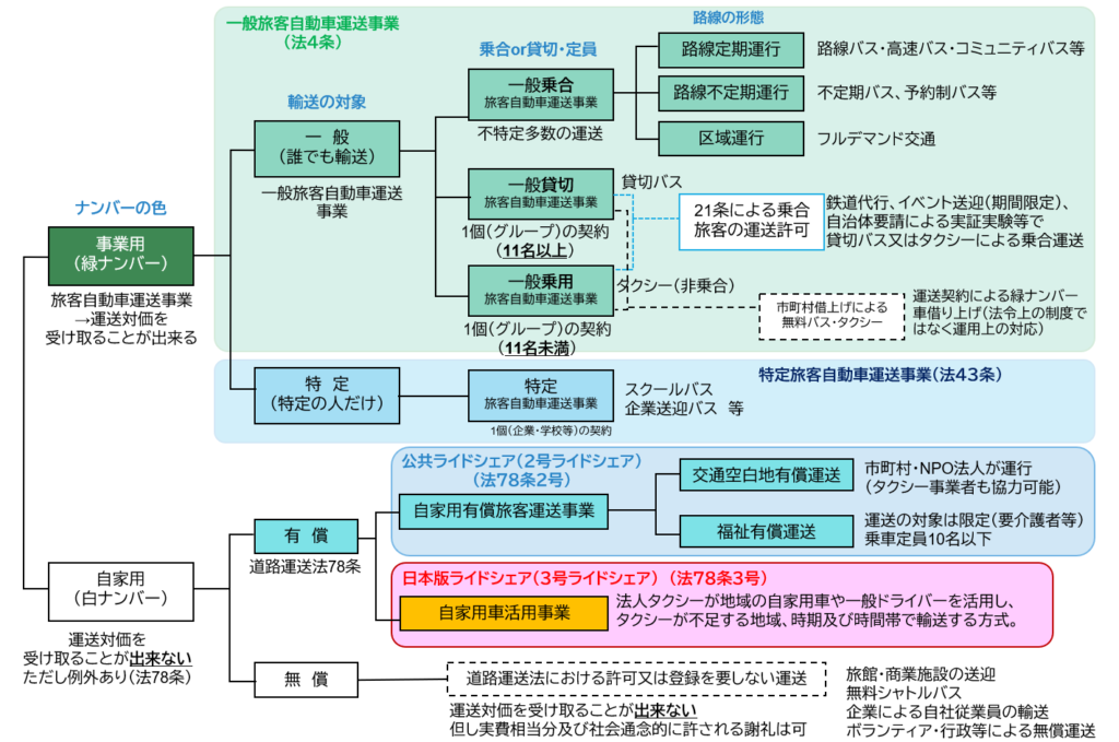• 福祉有償運送:要介護者や障害者など、特定の利用者に限定される輸送形態。