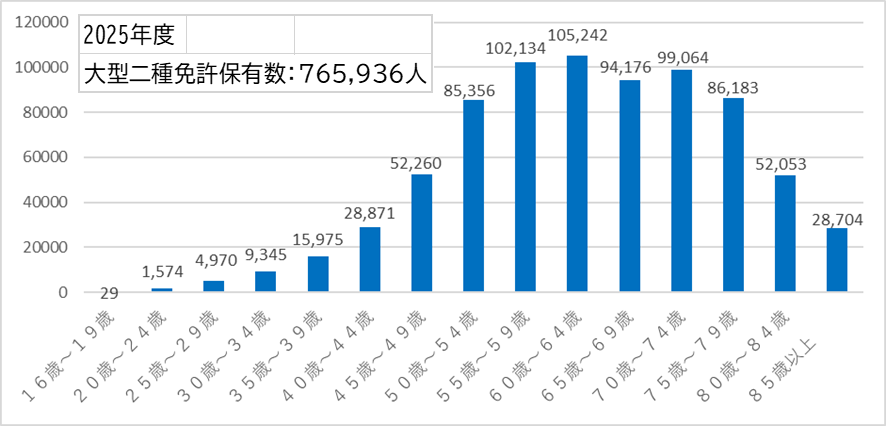 そこで,大型二種の運転免許保有者を確認すると全数では2025年で76.6万人であり,その年齢構成は(図-2)のようになっています.高齢者になると免許は保有しているけれど現役の運転士から引退されている方もいると思いますから,高齢者で実際に運転士をされている方はこの数字よりは小さいように思います.