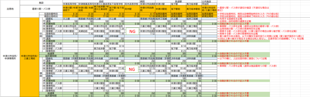 時刻表を用いて運行時刻を確認し、居住地側の駅/バス停から目的地側の駅/バス停までの移動時間を計測します。さらに、往路については最寄り駅/バス停から施設までの徒歩時間も考慮に入れた上で移動時間を把握し、始業時刻などが明確な場合には、それに間に合うかどうかを判断します。復路についても、終業時刻から最寄り駅/バス停までの移動時間を考慮に入れて乗車可能な便を判断し、移動時間を計測します。