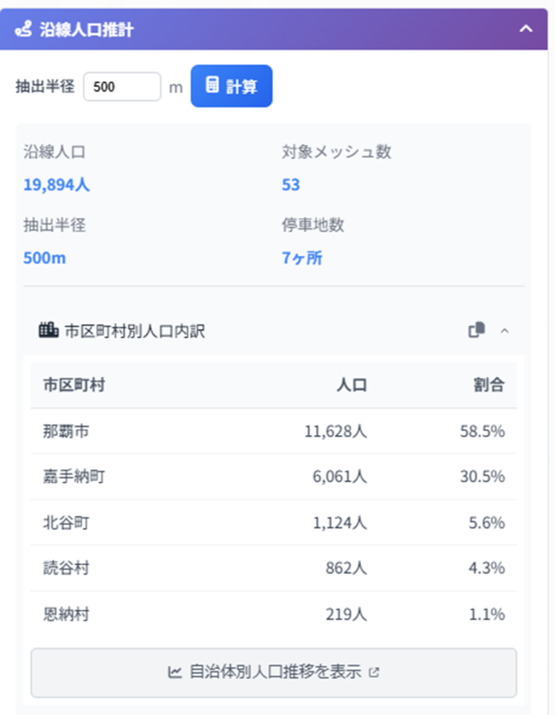人口推計機能では、2025年に実施された国勢調査の結果に加え、将来人口予測データが活用されています。バスルートが通過する市町村ごとの人口および将来人口の見通しが、数値とグラフで表示されます。また、各停留所から半径500メートル圏内に居住する人口もあわせて算出されます。