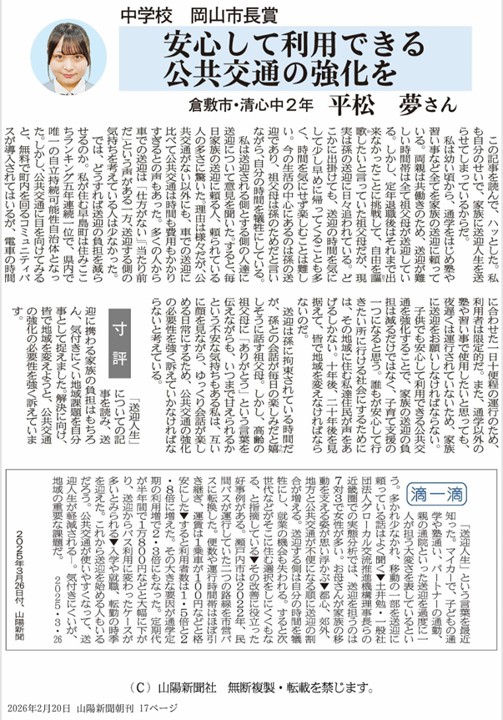 送迎人生についての新聞記事を読まれた中学生の方が感想文を書いて下さいました(図-1).この感想文は岡山市長賞を受賞されています.